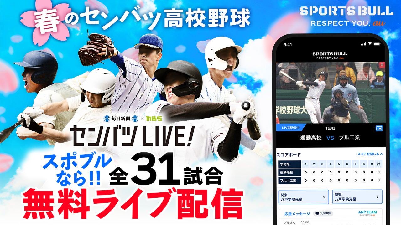 株式会社毎日新聞社(本社:東京都千代田区、代表取締役社長:松木 健、以下 毎日新聞社)、株式会社毎日放送(本社:大阪府大阪市北区、代表取締役社長:虫明 洋一、以下 MBS)、株式会社運動通信社(本社:東京都港区、代表取締役社長:黒飛 功二朗、以下 運動通信社)、KDDI株式会社(本社:東京都千代田区、代表取締役社長 CEO:髙橋 誠、以下 KDDI)は、運動通信社とKDDIが共同で運営するスポーツメディア「SPORTS BULL(スポーツブル)」内「センバツLIVE!」(https://sportsbull.jp/senbatsu/)において、2025年3月18日に開幕する第97回選抜高等学校野球大会(毎日新聞社、日本高等学校野球連盟主催、以下 センバツ高校野球)の全31試合を無料ライブ配信します。