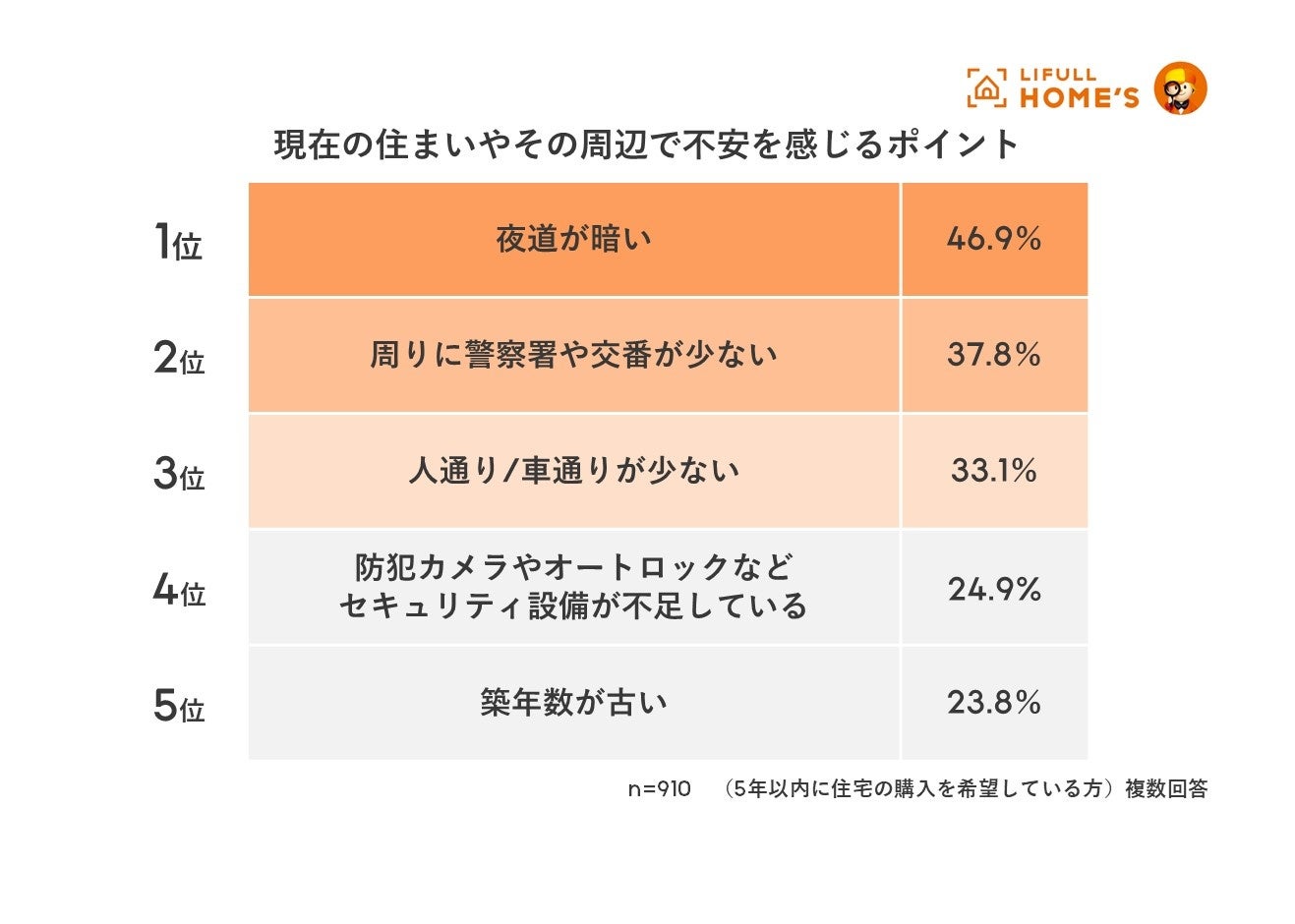 不安を感じるポイント1位は「夜道が暗い」。「隣に空き巣が入った」「最近犯罪が多い」の声も