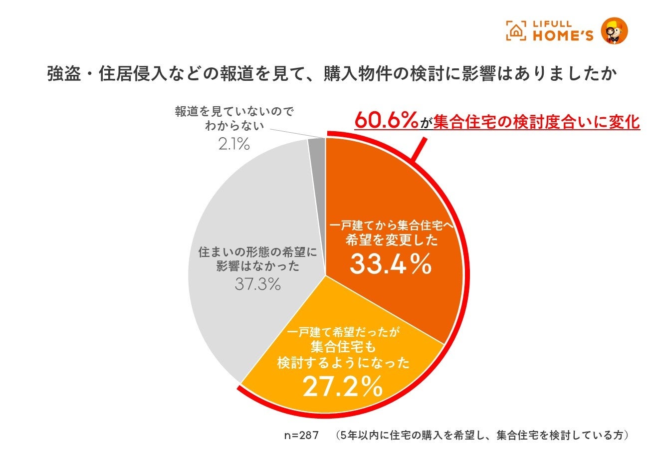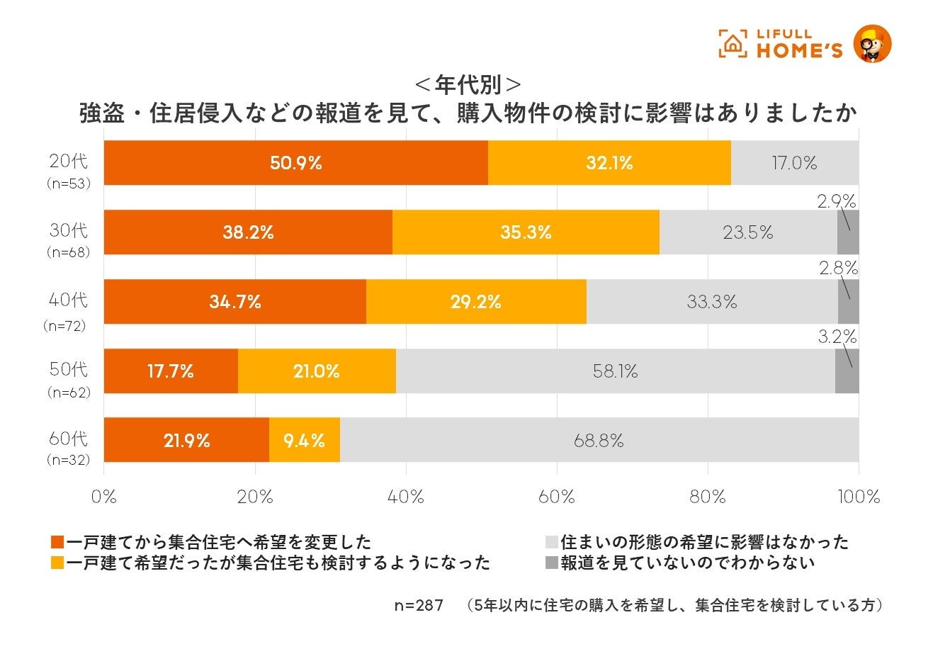 集合住宅購入検討者のうち、約6割が強盗住居侵入報道を受け、一戸建てから集合住宅への希望変更も検討。20代・30代の変更意向が比較的高い結果に