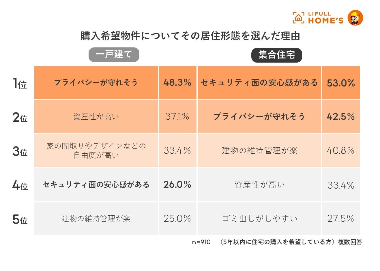 一戸建てと集合住宅それぞれの希望者に対し、その居住形態を選んだ理由について聞いたところ、一戸建てでは1位が「プライバシーが守れそう」(48.3%)、2位が「資産性が高い」(37.1%)となりました。一方、集合住宅では1位が「セキュリティ面の安心感がある」(53.0%)、2位が「プライバシーが守れそう」(42.5%)と、防犯に関連する項目が上位にランクインしました。