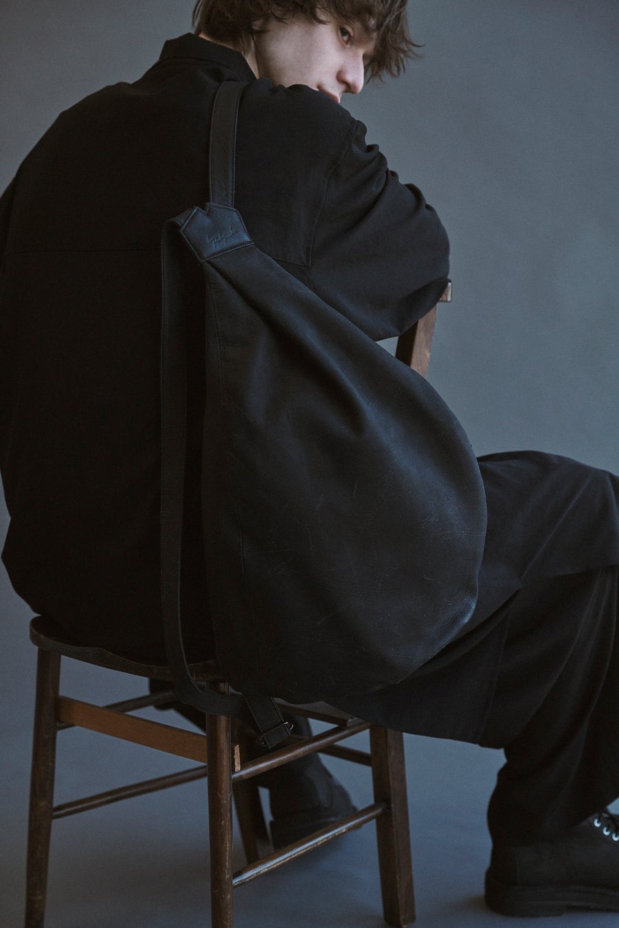 服のタックをモチーフにしたデザインディテール、中に物が入った時に美しく身に着けた時に存在感が出るフォルム。機能は全て裏側に備え、内側へのアクセスを背面のみにすることで、無駄なものが一切見えない美しい造形が、ダメージ加工された独特なレザーの表情を際立たせる。ボディ左側のマチ部分に「Yohji Yamamoto」シグネチャーがエンボスされた特別な仕様。