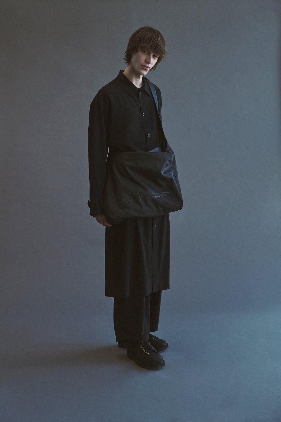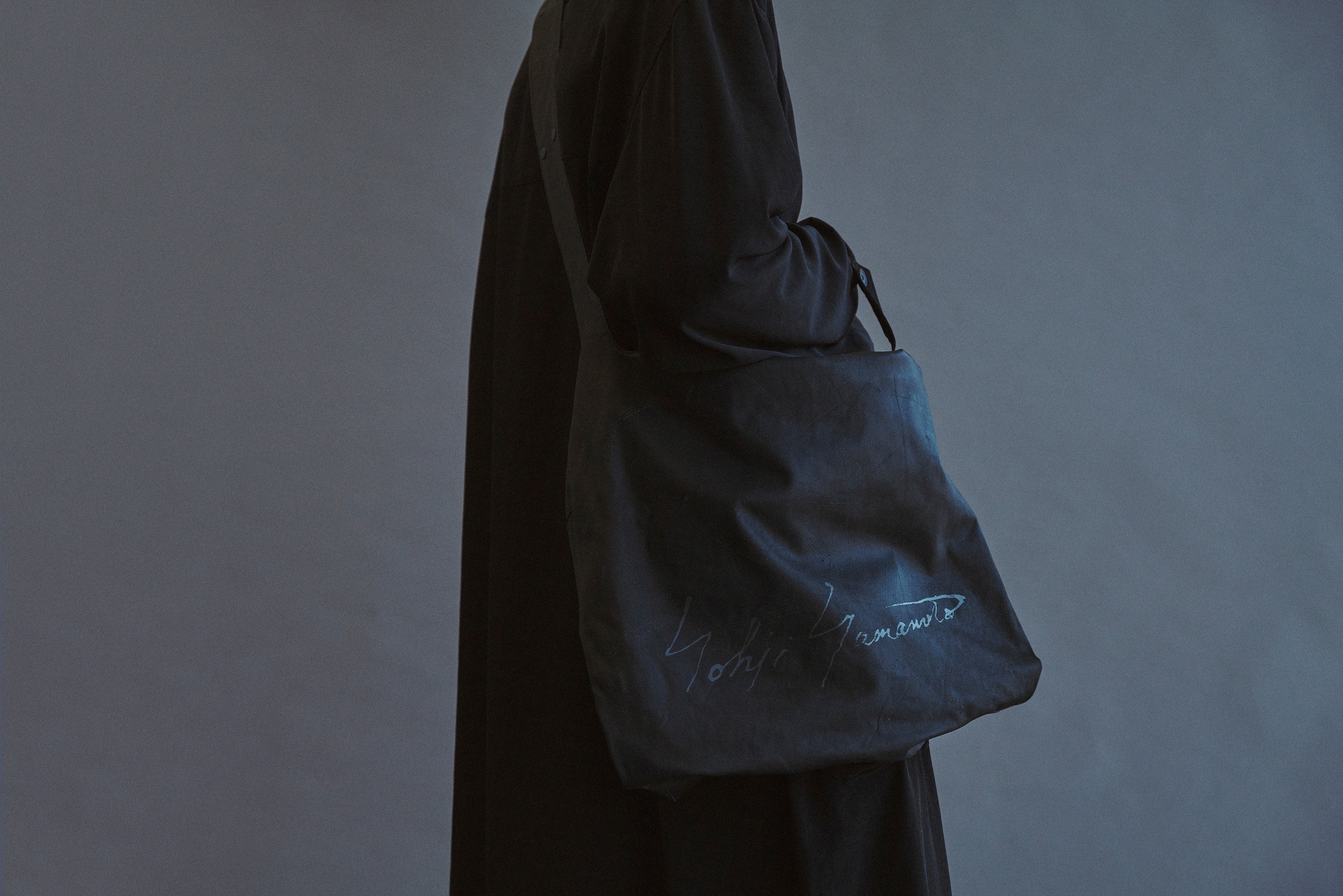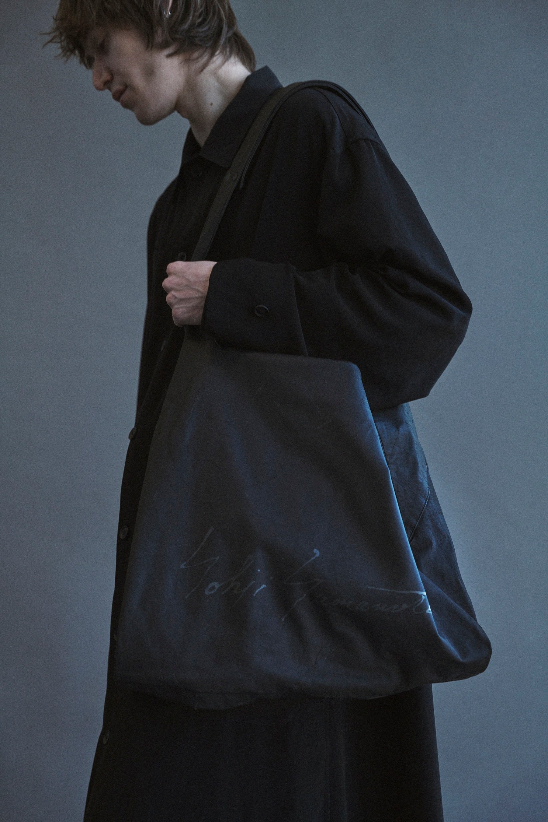ハンドルのドットボタンの組み換えで、3通りの形になるショルダーバッグ。ダメージ加工されたレザーに、デザイナー山本耀司が直筆した「Yohji Yamamoto」のシグネチャーが配されたデザイン。グレーで表現されたシグネチャーは本企画限定の特別なカラーリング。