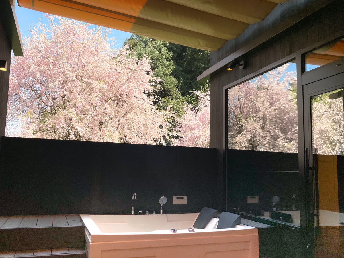 春には各客室のテラスから満開の桜を眺めることができ、サウナと水風呂の交互浴を楽しんだ後には、桜を眺めながら外気浴をお楽しみいただけます。