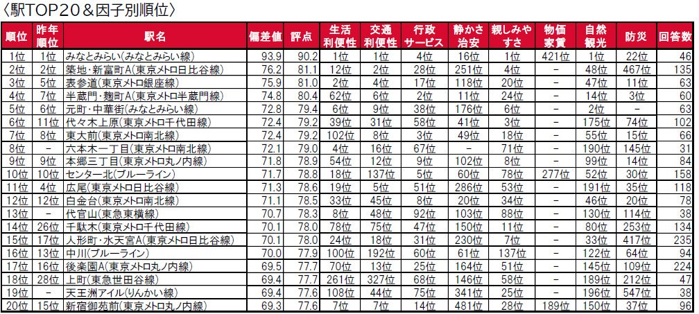 1位は、2年連続でみなとみらいとなっています。2位は、3年連続で築地・新富町A、3位は、昨年5位だった表参道が順位を上げました。6位には、昨年11位だった代々木上原、8位には、昨年は回答者数が30名に満たなかったため集計対象外だった六本木一丁目がそれぞれトップ10入りしています。上位10位のうち、3駅は神奈川県内の駅(みなとみらい、元町・中華街、センター北)です。
