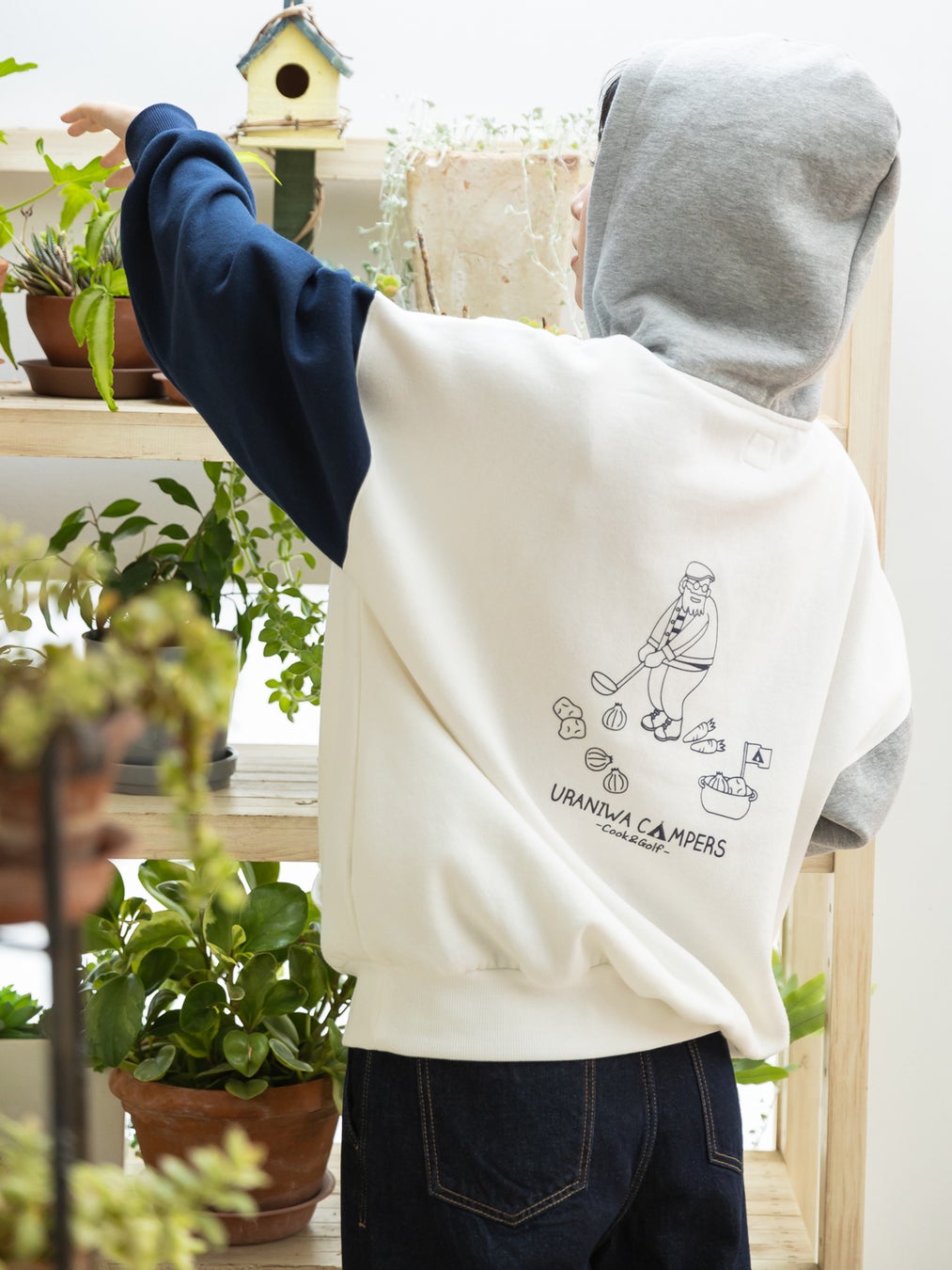 中でも一押しは、おじさんが料理でゴルフを楽しむ様子をバッグプリントで施したパーカーです。おたまをゴルフクラブのように持つおじさんや、ボール代わりのごろごろとした野菜、カップに見立て鍋など、遊び心あるイラストをプリント。さらに胸元にはさりげなくおじさんの顏を刺繍しました。クレイジーパターンを採用し、1枚で様になるデザインに仕上げました。