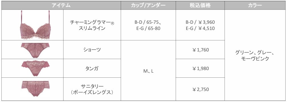 ブラジャーは、谷間ふっくら&スリムなシルエットを叶える「チャーミングラマーⓇ スリムライン」。ショーツはお好みに合わせて選べる3種類をご用意しました。日常に特別な輝きを添える、しなやかでエレガントなコレクションです。