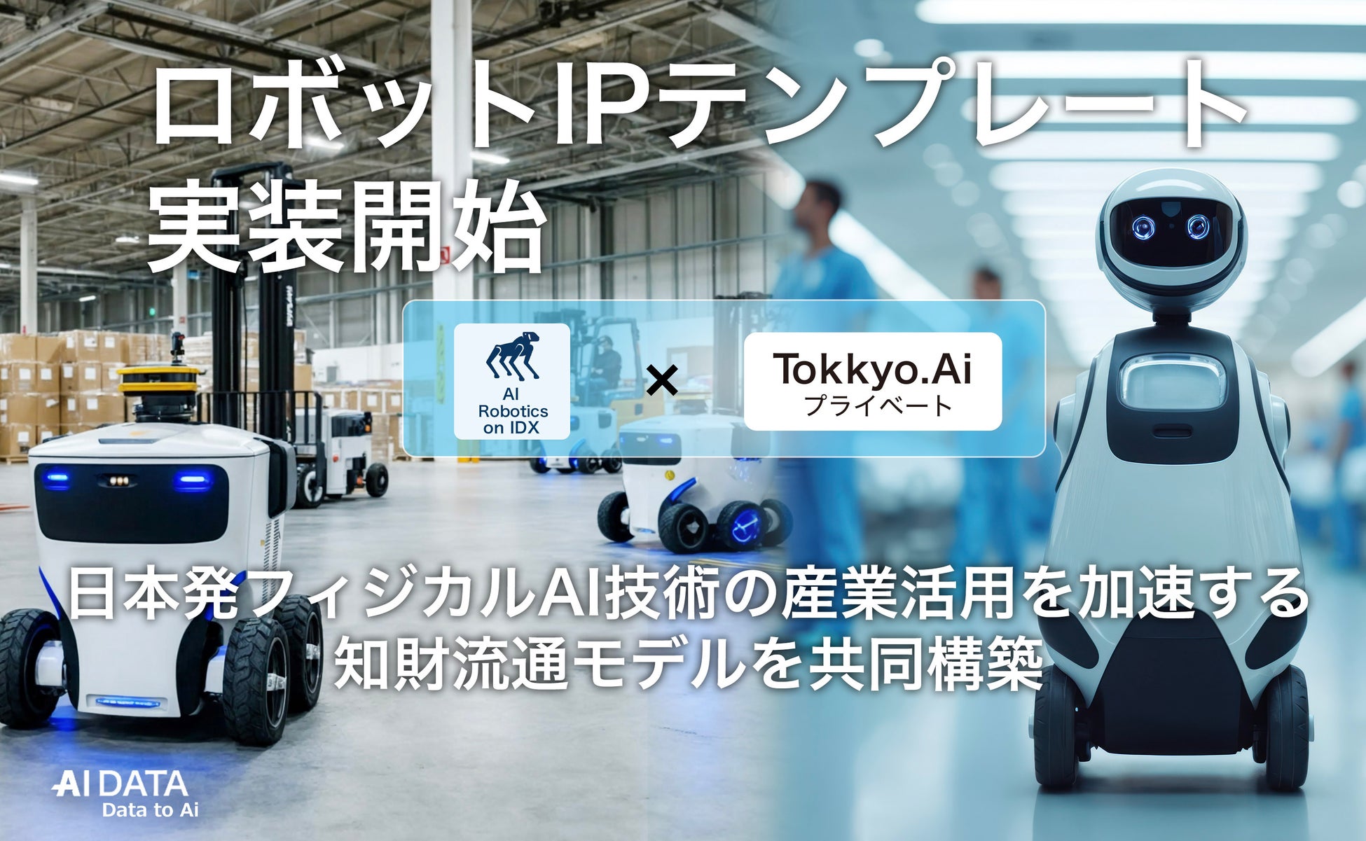 企業データとAIの利活用カンパニー、AIデータ株式会社(本社:東京都港区、代表取締役社長 佐々木隆仁)と、リーガルテック株式会社(本社:東京都港区、代表取締役:平井 智之)は、日本発のフィジカルAI技術を対象とした共同発表として、AI知財プラットフォーム「Tokkyo.Ai」とロボット知能基盤「AI Robotics on IDX」を活用した「ロボットIPテンプレート」の実装を開始した。