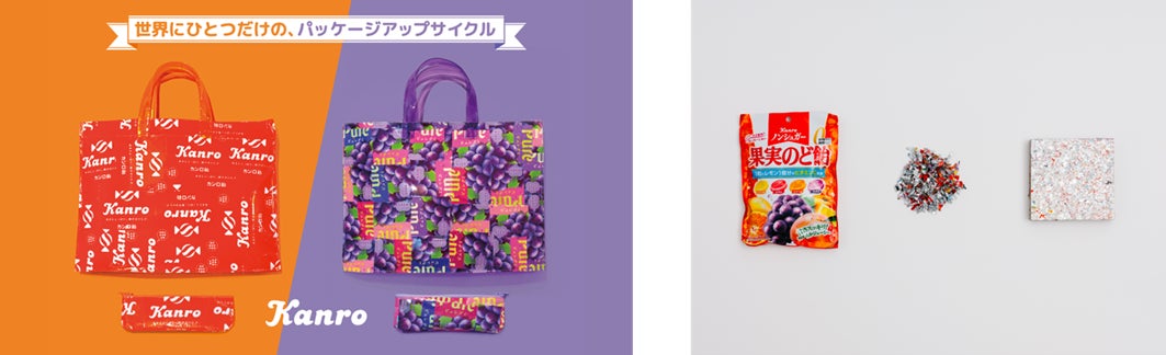 カンロでは、フューチャーデザイン事業の一環として廃棄包材のアップサイクルに取り組んでおります。製造工程上どうしても生じてしまう廃棄包材(年間約94トン/2023年実績)が課題となっており、商品パッケージに多く使われている複合フィルムや印刷されたフィルムは通常リサイクルが困難とされていましたが、デザインファーム「ペーパーパレード」と協業することで、廃棄予定のパッケージをそのまま活かし、アップサイクルした雑貨(バッグ、サコッシュ、ペンケース)の製作を行いました。クラウドファンディングのプロジェクトとしてスタートした後、ポップアップストアやオンラインショップでの販売を行うことで、ブランド価値向上にもつながっております。さらに、海洋プラスチックや施設・企業から出るプラスチックゴミをマテリアルリサイクルするスタートアップ企業「リマーレ」と協業し、カンロ商品の廃棄包材を粉砕・熱圧着して板状にし、建材等に応用できないか試作を行い、資源循環型社会実現を目指す取り組みも実施しています。