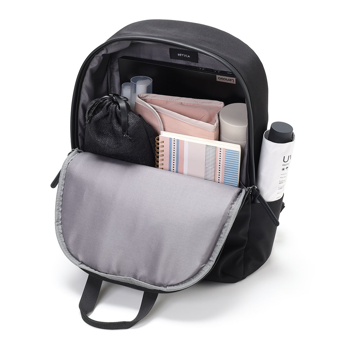 シーンを選ばないユニセックスなデザインで通勤にも、子育てにも寄り添います。16.5Lと大容量ながらもコンパクトかつ578gと軽量。撥水仕様なので雨の日でも安心です。10個のポケットで荷物の定位置が決まるため、どこに何があるか一目でわかるのも特長。日常使いはもちろん、災害時の持ち出し品を入れておけば防災リュックとしても活躍します。
