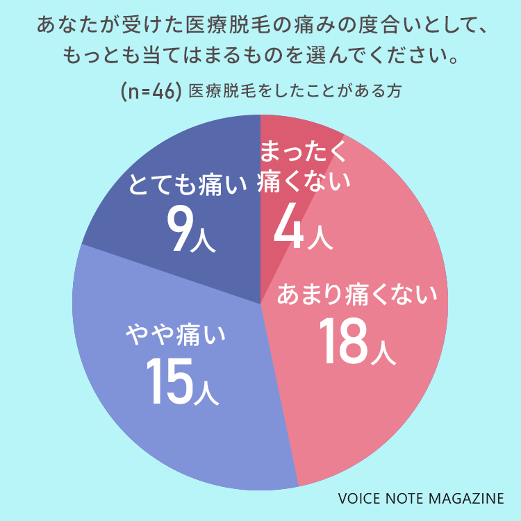 医療脱毛の痛みの度合いとして最も多かったのは、46人中18人(約39.1%)が答えた「あまり痛くない」でした!