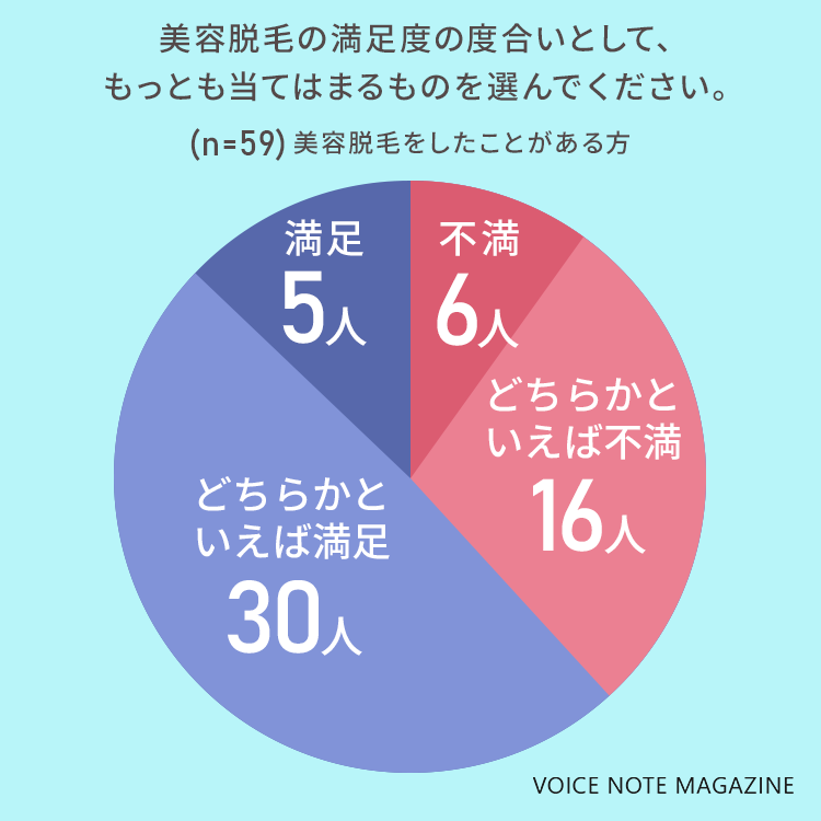 美容脱毛の満足度の度合いとして最も多かったのは、59人中30人(約50.8%)が答えた「どちらかといえば満足」でした!