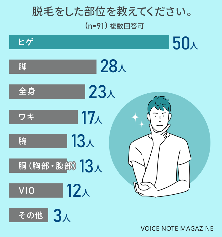 そこで今回は、事前調査で「脱毛をしたことがある」と回答した男性のボイスノート会員91人に、実際に脱毛をした部位について調査してみました!