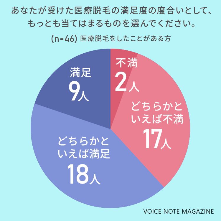 医療脱毛の満足度の度合いとして最も多かったのは、46人中18人(約39.1%)が答えた「どちらかといえば満足」でした!