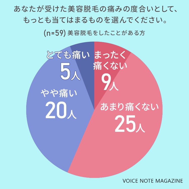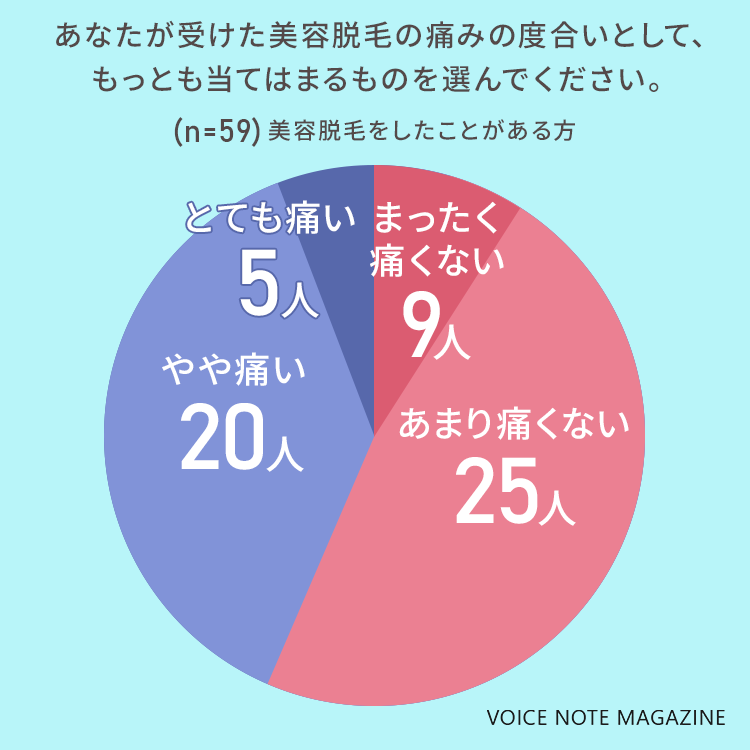 美容脱毛の痛みの度合いとして最も多かったのは、59人中25人(約42.4%)が答えた「あまり痛くない」でした!