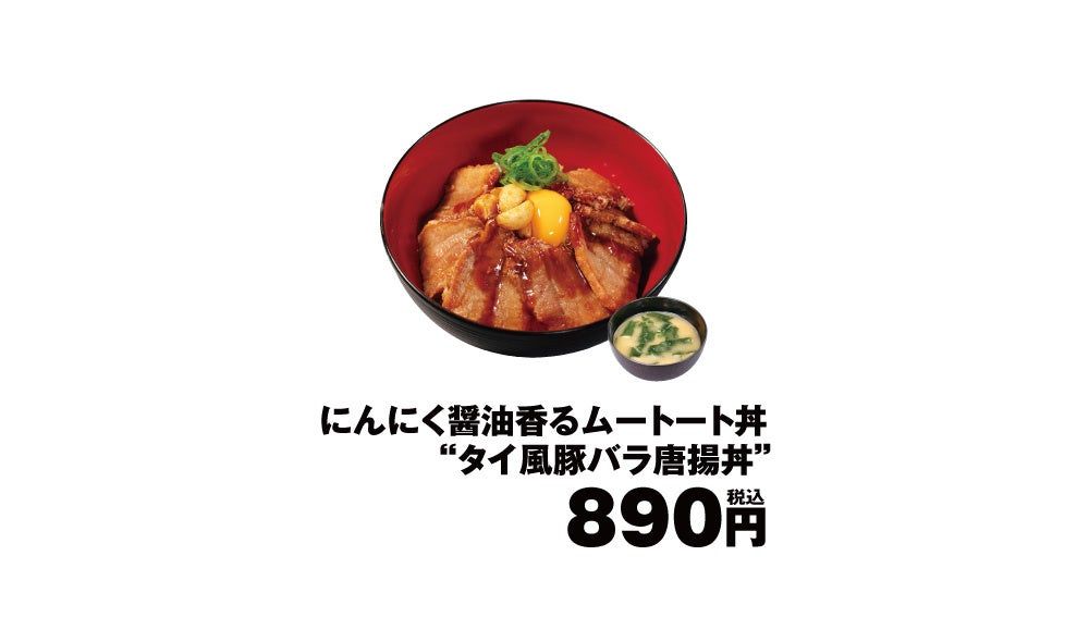 商品名 にんにく醤油のムートート丼“タイ風豚バラ唐揚丼” 890円 ※全て税込価格です。また、店内・お持ち帰りの税込価格は同一です。 ※お持ち帰りいただけます。お持ち帰りのみそ汁は、別途60円でお買い求めいただけます。 ※株主優待券は上記のメニューにご使用いただけます。