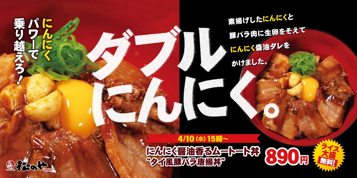先日初登場を遂げ、好評販売中の「ムートート」が丼になって登場します!「ムートート丼」は、豚バラ肉を醤油ベースの特製揉みダレに漬け込み、パリっとジューシーに揚げた、カリカリ食感がたまらない“タイ風”豚バラ唐揚げ「ムートート」に、生卵と素揚げしたにんにくを添えて、にんにく醤油ダレをかけた至高の丼。食欲を刺激する香りに、お箸が進むこと間違いなし。新年度が始まり気疲れしやすいこの時期に、にんにくパワーで1日の疲れを吹き飛ばせ!松のや開発担当も唸る「ムートート丼」、是非ご賞味ください。