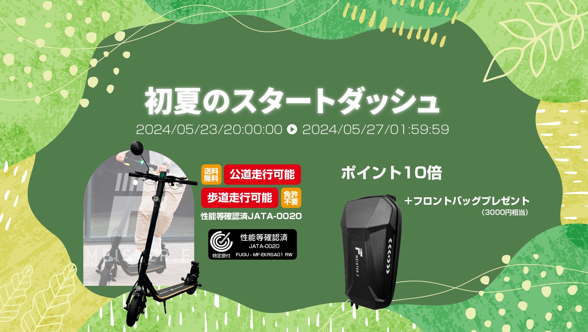 楽天「Show !t」では、アフターメンテナンス付きで安心!7万円台で特定小型電動キックボードを販売中。5月23日からのお買い物マラソンで購入するとポイント10倍、さらにフロントバッグをプレゼント。
