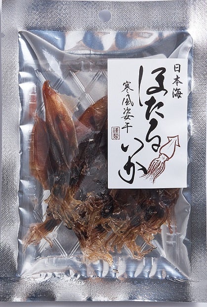 日本海で漁獲された旬のほたるいかを秘伝の調味液に漬け込み、独自の寒風製法で干しあげた「極旨珍味」です。そのままでも美味しくお召し上がりいただけますが、ご自宅では炙って食べるのもおすすめです。
