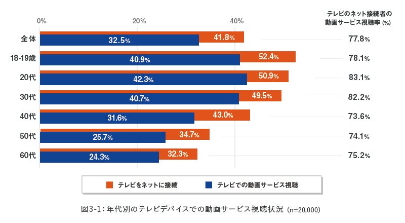 テレビでの動画サービス視聴率は全体の32.5%で、テレビをネット接続している人をベースにすると77.8%の視聴率でした。人口に換算すると2,700万人の規模となります。年代別で見ると30代以下の若い世代でいずれも40%を超え、40代も31.6%、50~60代においても約25%となっています。(図3-1)