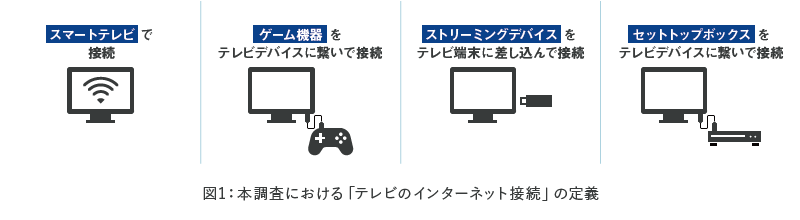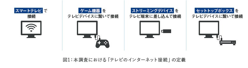 コロナ禍での外出自粛による「おうち時間」の増加や、オリンピック起因により、スマートテレビ等のインターネットに接続したテレビの利用が浸透し、YouTubeやNetflix、TVer等の動画サービスもテレビ画面で視聴される機会が増加したことが推察されます。テレビの用途が多様化し、生活者を取り巻くメディア環境が大きく変化していることを踏まえ、最新の市場を確認するべく本調査を実施しました。なお、本調査では、以下の環境を「テレビのインターネット接続」と定義しています。