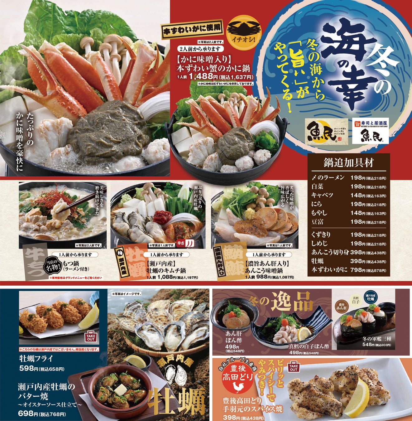 株式会社モンテローザ(本社:東京都杉並区 代表取締役:大神輝博)は、「魚民」「寿司と居酒屋 魚民」で季節限定メニューの販売を開始します。”本ずわい蟹”を使用した『かに鍋』をはじめとした各種『鍋料理』や『瀬戸内産牡蠣のバター焼』『あん肝ぽん酢』『白子ぽん酢』など、冬の海の幸をラインナップしました。