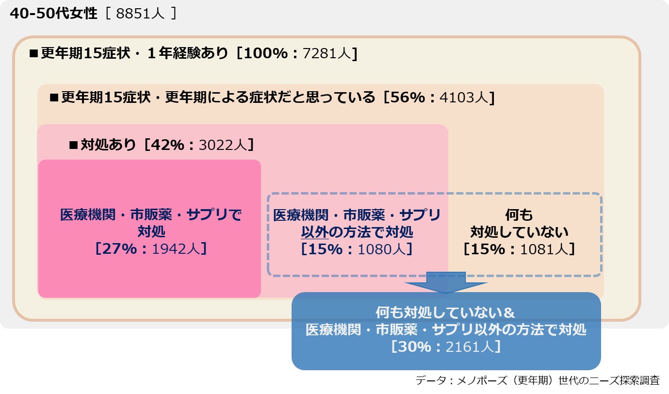 ※3: 更年期症状と定義した15種類の症状の1つ以上を経験し、かつ、更年期による症状と認識しているが「医療機関を受診」「市販薬・サプリメントの使用」「その他 セルフケア」による対処のいずれも行っていない人。または、15種類の症状を更年期による症状と認識していない人