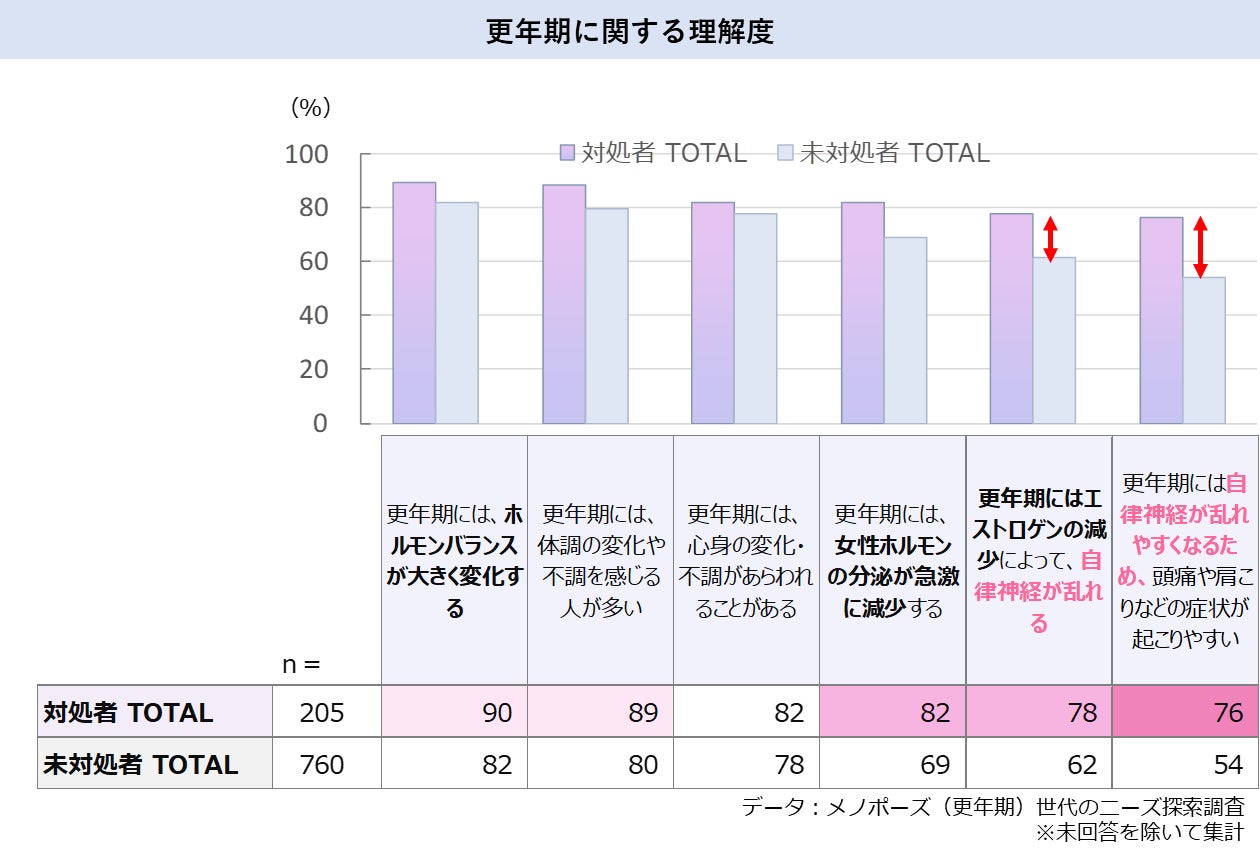 「未対処者」は「対処者」と比較し、更年期の理解度が低い。特に「自律神経の乱れ」関連は差が大きい