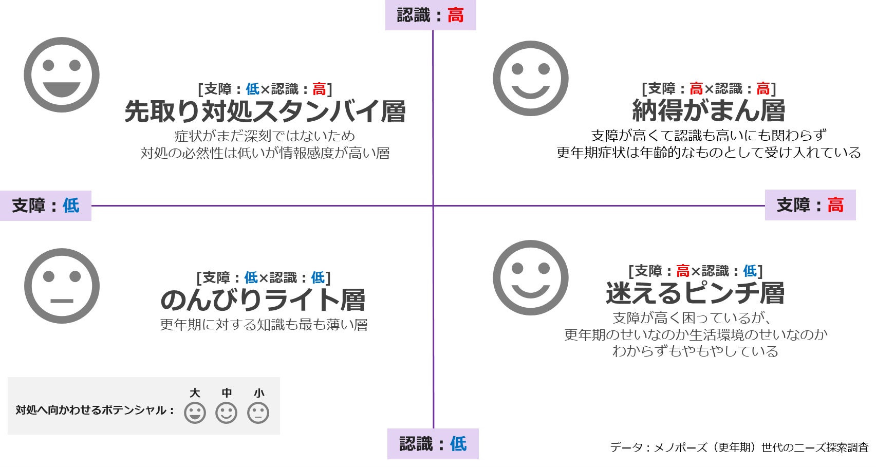 「未対処者」を更年期症状の程度や更年期に対する理解度別に4つのセグメントに分類。セグメントごとに対処意向、潜在的な需要も異なる