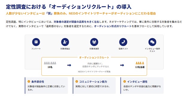 この「オーディションリクルート」は、ネオマーケティングのインサイトリサーチャーが対応し、クライアント様にも参加いただくことで、納得感のある対象者選定を実現しています。これにより、インタビュー本番での「対象者が想定と異なる」「インタビュー時の会話がスムーズに進行しない」といった"明確ではないが確実に影響する対象者とのミスマッチ"を排除し、より質の高いインサイトの抽出を可能にしています。