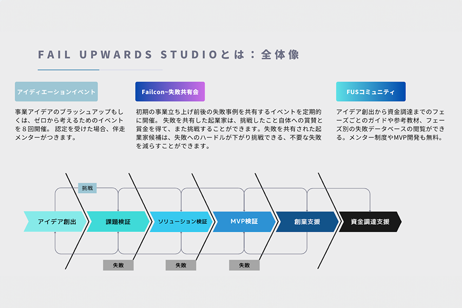 FAIL UPWARDS STUDIOでは起業を目指す方の段階に応じた複数のサポート内容を並行して展開します。アイデア創出や検証など、起業するまでには乗り越える壁がいくつもあり、途中でうまくいかなくなることも多々ありますが、何度でもアイディア創出に取り組むイベントに参加できるなど、再挑戦を行う仕組みがあります。