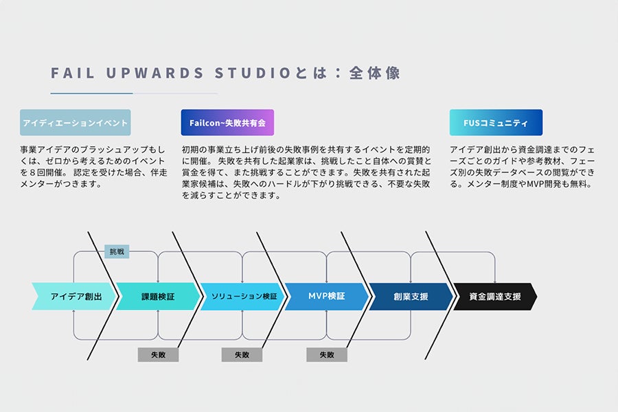 本取り組みでは、インキュベーションプラットフォーム「FAIL UPWARDS STUDIO」を新しく設立します。25歳以下の学生・若手が「失敗とピボット」の経験を繰り返しながら切磋琢磨し、起業の成功確率を高め、同時多発的にスタートアップを生み出す環境をつくるためのイベントやコミュニティ、伴走支援を行います。