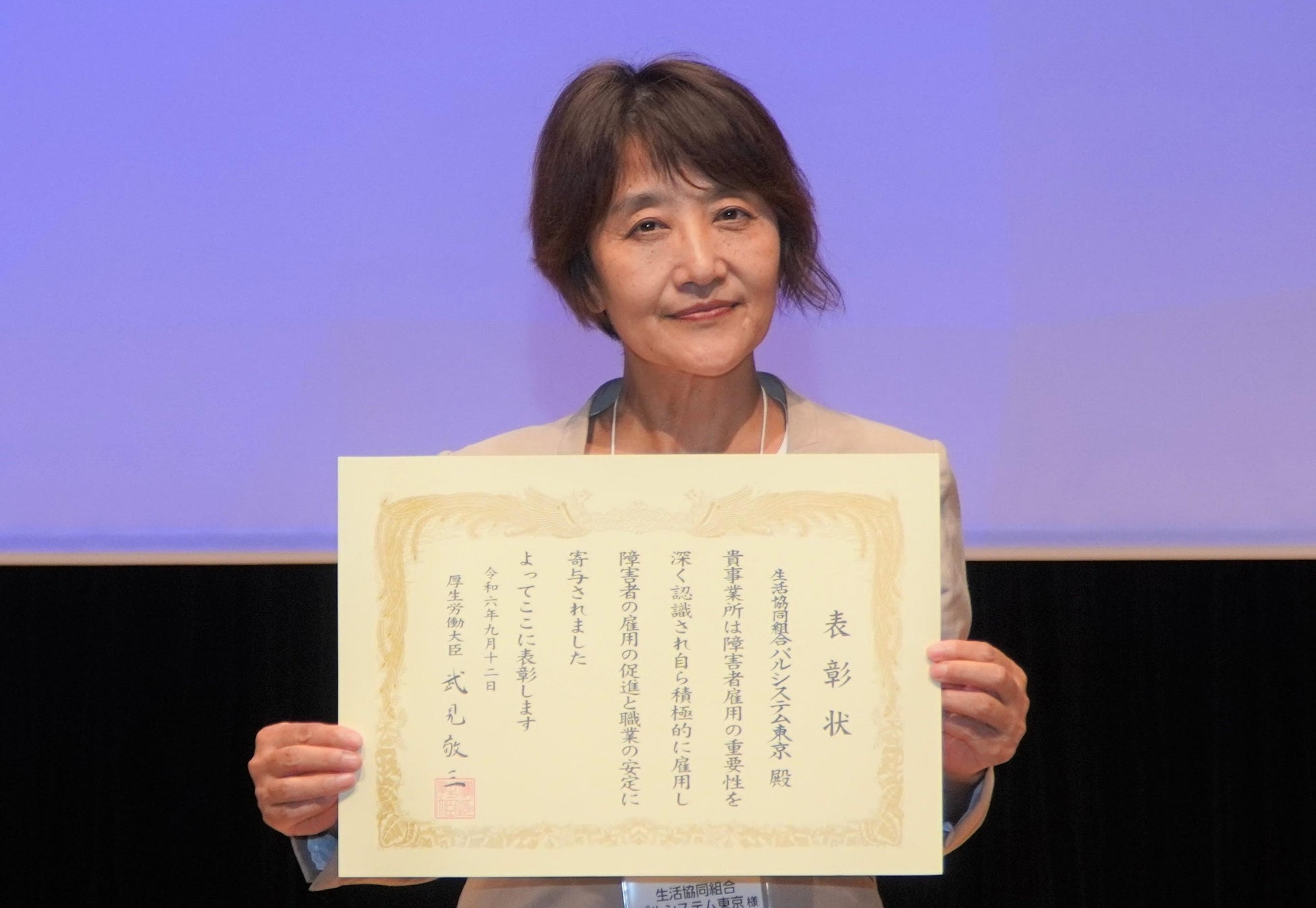 生活協同組合パルシステム東京(本部:東京都新宿区大久保、理事長:松野玲子)はこのたび、令和6年度「障害者雇用優良事業所厚生労働大臣表彰」を受賞しました。障害者雇用月間の9月12日(木)に大手町三井ホール(千代田区大手町)で授賞式が行われ、松野理事長が表彰状を受け取りました。