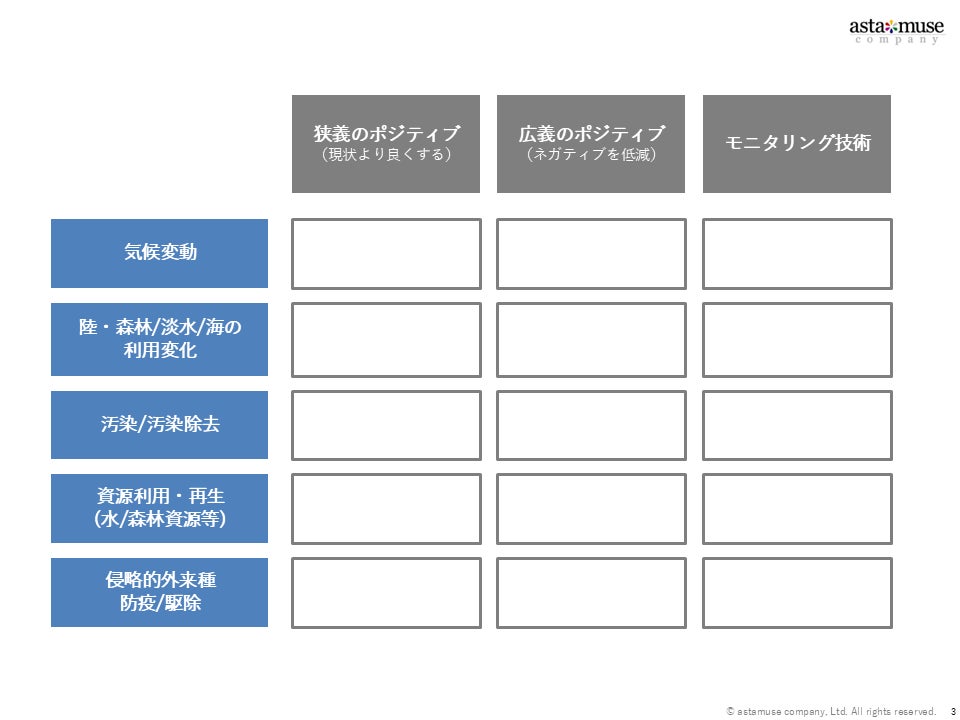 このような現状をふまえ、アスタミューゼではネイチャーポジティブの概念を以下の3つの視点で整理します。