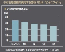 除毛剤は、皮膚の上に生えている部分の毛を化学的に分解して除去するため、なめらかな仕上がりで生え始めの毛がチクチクしないむだ毛処理アイテムです。当社の調査(2023年)によると、むだ毛処理剤を使用する部位の1位には「ビキニライン」が挙がり、清潔感や自分自身が満足できる姿を重視して、生え始めのチクチク感を避けるために除毛剤を使用している傾向が見られました。