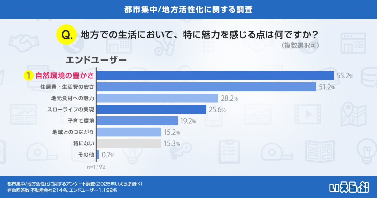 「地方での生活において、特に魅力を感じる点は何ですか?」という質問では、「自然の豊かさ」(55.2%)、「住居費・生活費の安さ」(51.2%)が上位となり、さらに「地元食材への魅力」(28.2%)など、地方ならではの価値に魅力を感じていることが分かります。