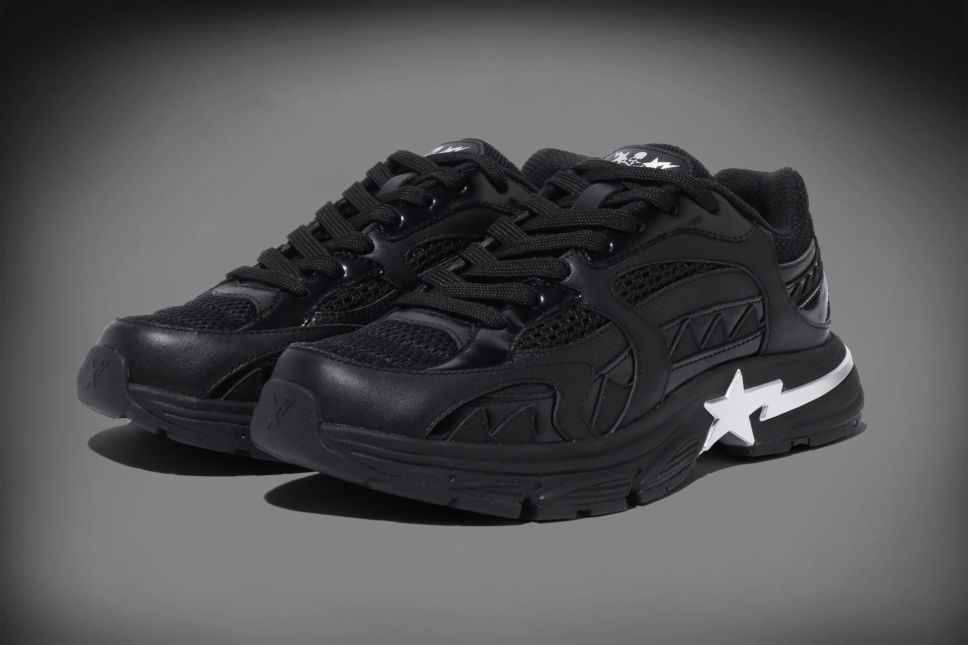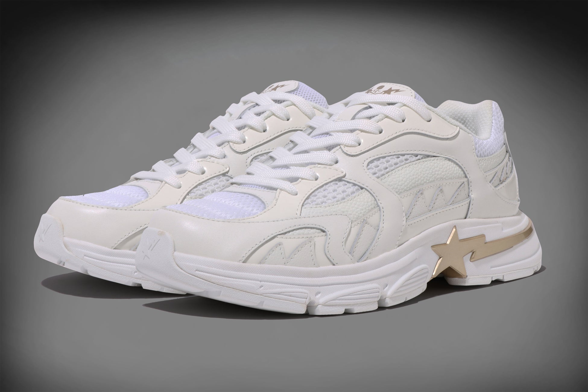 最新フットウェアの“SHARK STA”は、ブラックとホワイトの2色がラインアップします。各色それぞれワントーンで全体をまとめ、ブラックはシルバー、ホワイトはゴールドでロゴを配置。踵から流線型を描くようにSTAを配したミッドソールもポイントです。