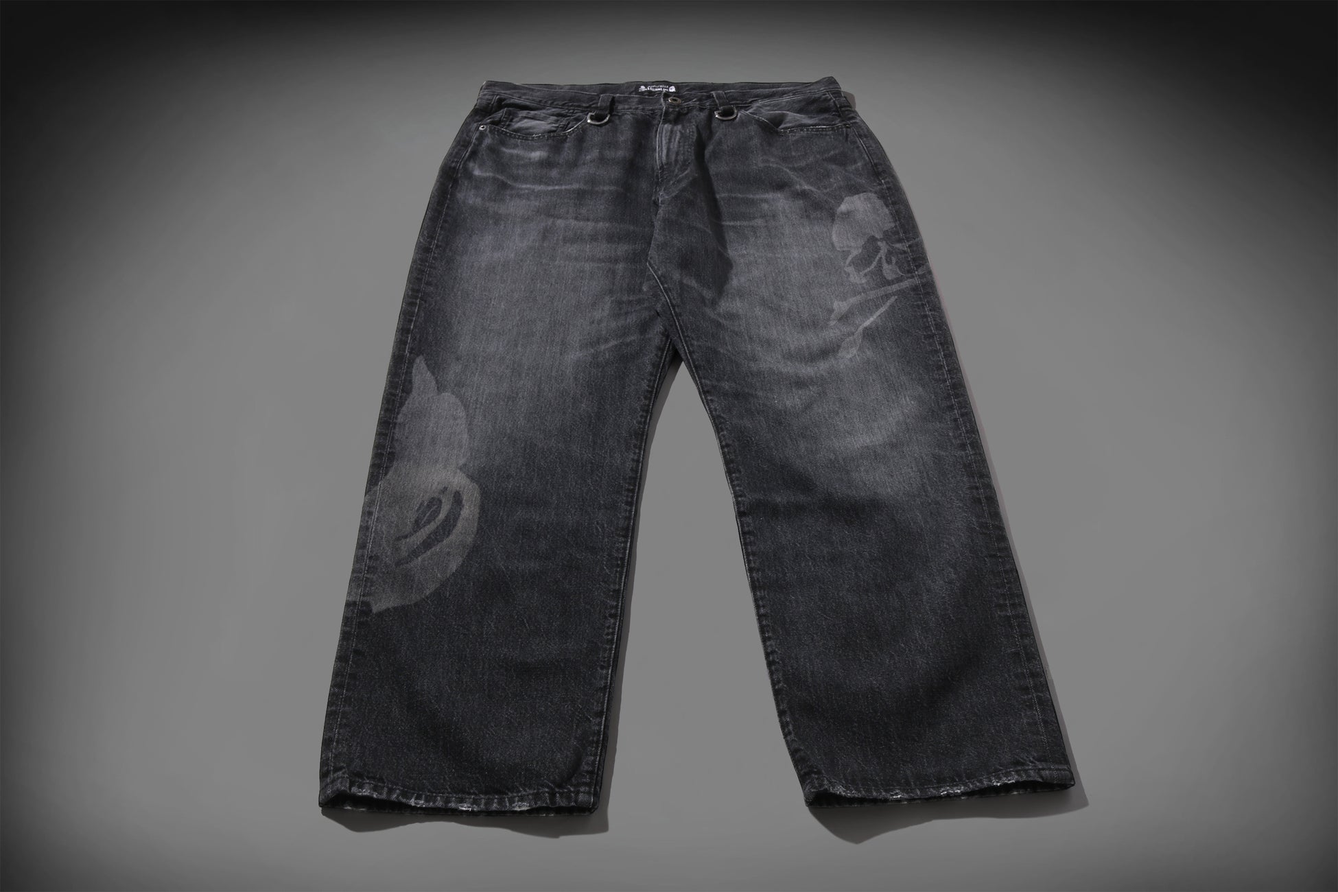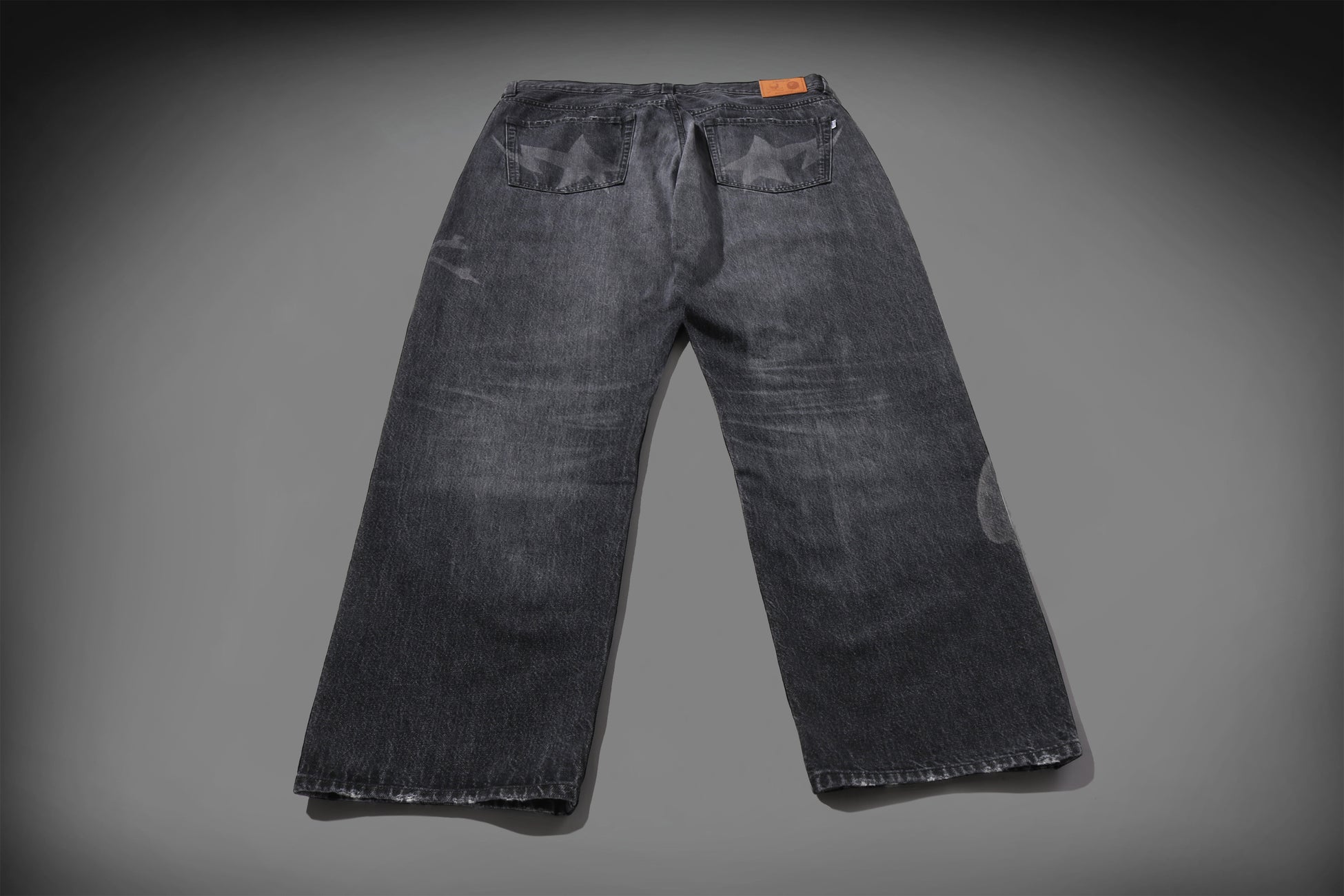 ジーンズはブラックデニムを使用し、ウォッシュ加工を施すことで、はき込んだような自然なニュアンスを醸します。さらに、サイドにクロスボーンスカルとAPE HEADのロゴを、バックポケットにSTAをレーザー加工で表現することで、ビンテージジーンズにはないオリジナリティを加えました。