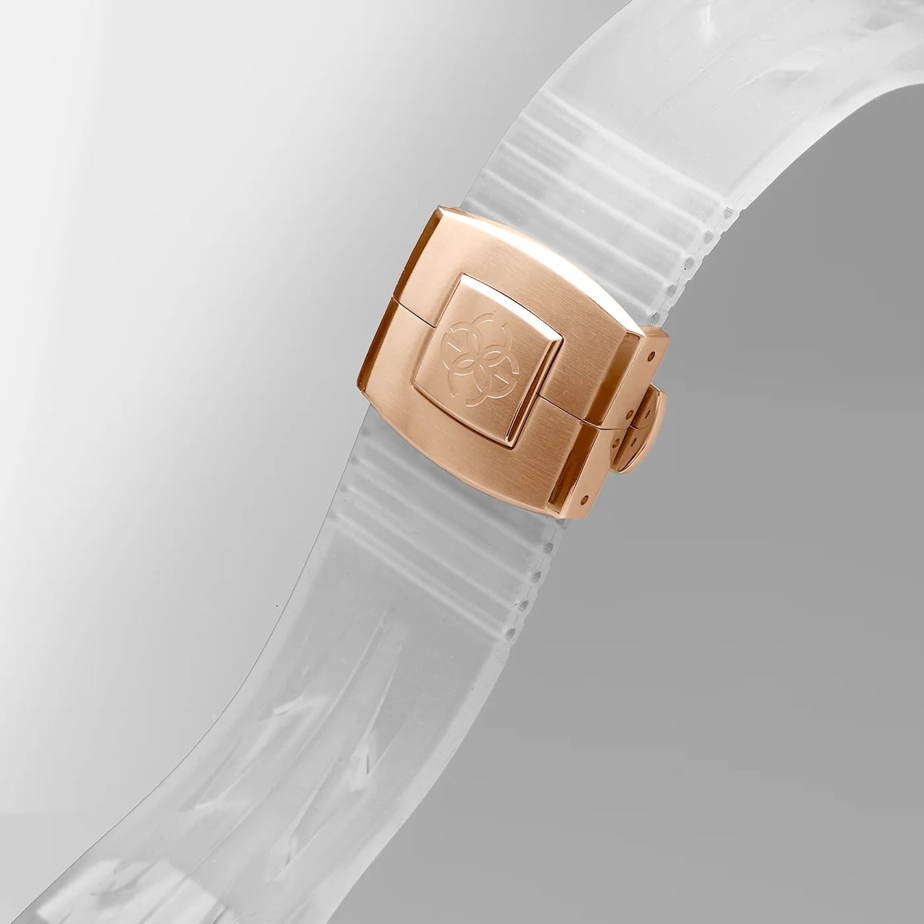 高密度の半透明シリコーンラバーで作られたこのストラップは軽量で柔軟性を持ち合わせています。透明な外観とチタン製バタフライバックルが耐久性とエレガンスを兼ね備えています。「スナップオンストラップ」を搭載しているため、着脱もワンタッチで簡単に行えます。