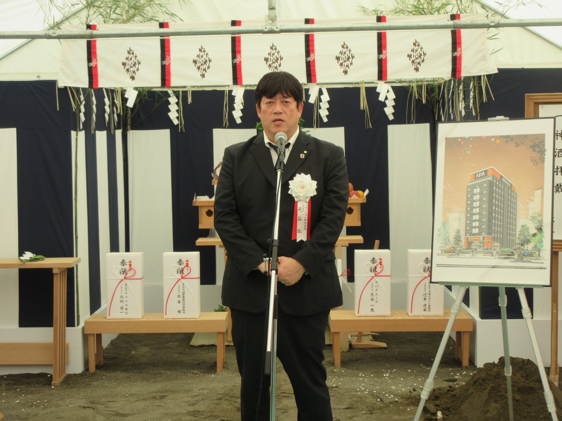 神事後の挨拶にて、アパグループ専務 元谷 拓は、「本日、晴天にも恵まれた中で起工式を執り行うことができてうれしく思う。西葛西ではフランチャイズのアパホテル〈TKP東京西葛西〉が開業した土地でもあり、ビジネスホテルも多く、ホテルの激戦区となっている。また東京メトロ東西線で都心の「大手町」や「日本橋」へもアクセスできる。さらに江戸川区は子育て支援が拡充しており、「東京ディズニーリゾート®」にも近いため、カップルやファミリーにも人気があり、ビジネスにも観光にも利用できる至便な立地となる。来年の開業に向けて、1ホテル1イノベーションの理念の下、進化を前向きに受け止めて工事を進めて欲しい。ホテルがあるからこそ街は発展するので、経済発展の受け皿となるホテルを皆で誇りをもって作り、完成した暁にはお客様に感動を与えられるよう、全員でアイデアを出し合いながら、地域に愛されるホテルを目指して欲しい」と述べた。