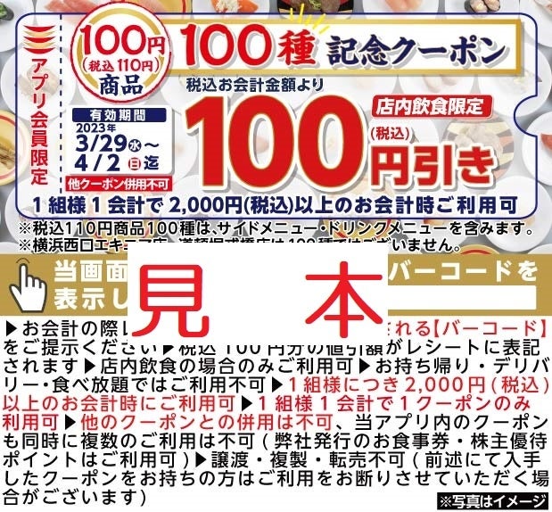・内容:店内飲食2,000円(税込)以上ご利用いただき、レジにてかっぱ寿司公式アプリ内の対象クーポンをご提 示いただいたお客様のお会計税込金額より100円(税込)引きいたします。
