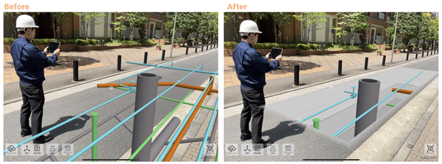 現実空間にAR表示で仮想の穴を空け、その穴の中に3Dモデルの埋設部を配置することができる機能です。この機能により、埋設部が地下にあることを認識しやすくなり、図面だけではイメージしづらかった埋設物がどのように設置されるかを把握しやすくなります。複雑に交差する地下下水路の切り替え工事などでは、事前にCIMモデルの取り合いを確認できるようになり、関係者間の合意形成や工事計画の検討にかかる時間の短縮が期待できます。