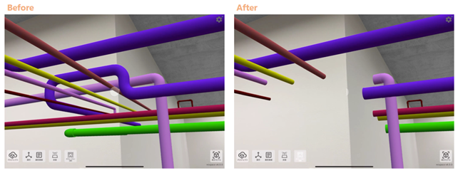 AR表示した3Dモデルと現実空間にある物体が重なったとき、その前後関係をLiDARセンサーによって判断し、現実の物体の陰になる部分の3Dモデルを隠すことができる機能です。この機能により、壁を貫通する配管などの3Dモデルを表示した場合、壁面をLiDARセンサーで認識することで3Dモデルが壁面で遮断され、部屋の内部側のみを確認することが可能です※2。