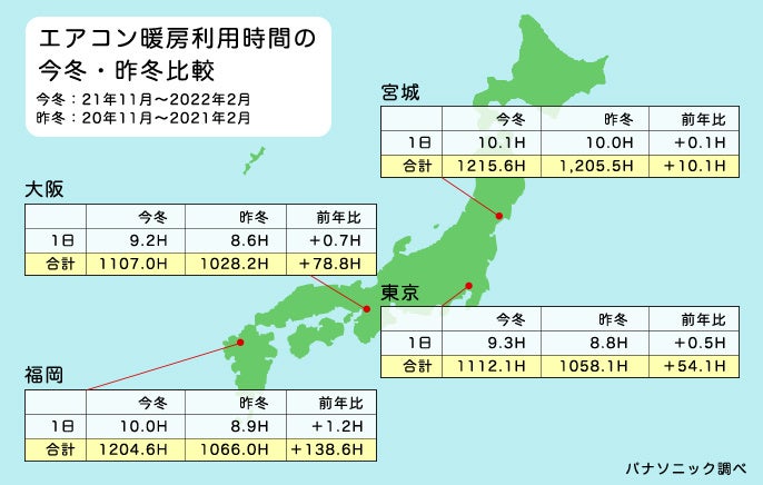 パナソニックは、エオリアアプリに接続したエオリアユーザーの利用データをもとに、「2021年-2022年 冬のエアコン使用実態調査」を実施。宮城県・東京都・大阪府・福岡県の4都府県の、2021年11月~2022年2月のエアコン暖房利用時間を、昨シーズンの同期間と比較しました。