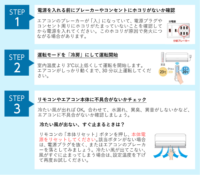 エアコン掃除を終えたら、続いてエアコンを運転し、不具合がないか確認する「試運転」をしておくことが大切です。次の3つのSTEPで「エアコン試運転」を行いましょう。
