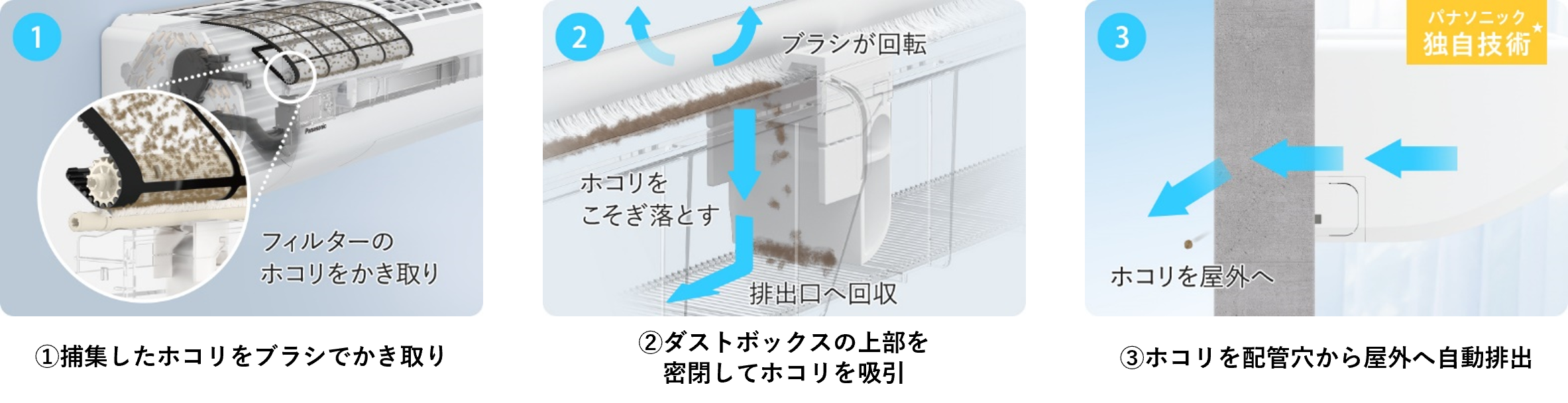 『エオリア』に搭載された“フィルターお掃除ロボット”は、累積24時間以上運転すると、自動で掃除を始めるという機能を持っています。フィルターが自ら動き、びっしりと配置されたブラシでクリーニングすることで、フィルターのホコリをしっかりとかき取り、キレイに取り除いてくれます。さらに、自動で捕集したホコリをブラシでかき取り、ダストボックスに入れ、配管穴から屋外へ自動で排出してくれる※ため、ホコリに直接触れることなく、フィルター掃除を完了させることができます。