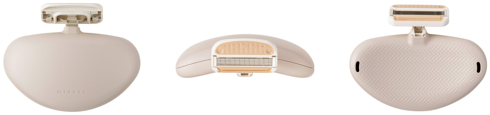 うで‧あし用カミソリとして、剃毛部と操作部の距離を極力近くすることが最適と考え、コンパクトで自由な持ち方ができる新たなホルダー形状を考案した。手の拇指対向性を基本とした持ちやすさを与えつつ、未使用時には刃が床に接地しない形状とした。ホルダー裏面にはブランドロゴをモチーフとした「i」パターンを配置し、滑り止め効果を持たせた。本体を清潔に保てるよう、シンプルかつシームレスな形状を心掛け、風呂や洗面エリアでのインテリア性にも寄与した。