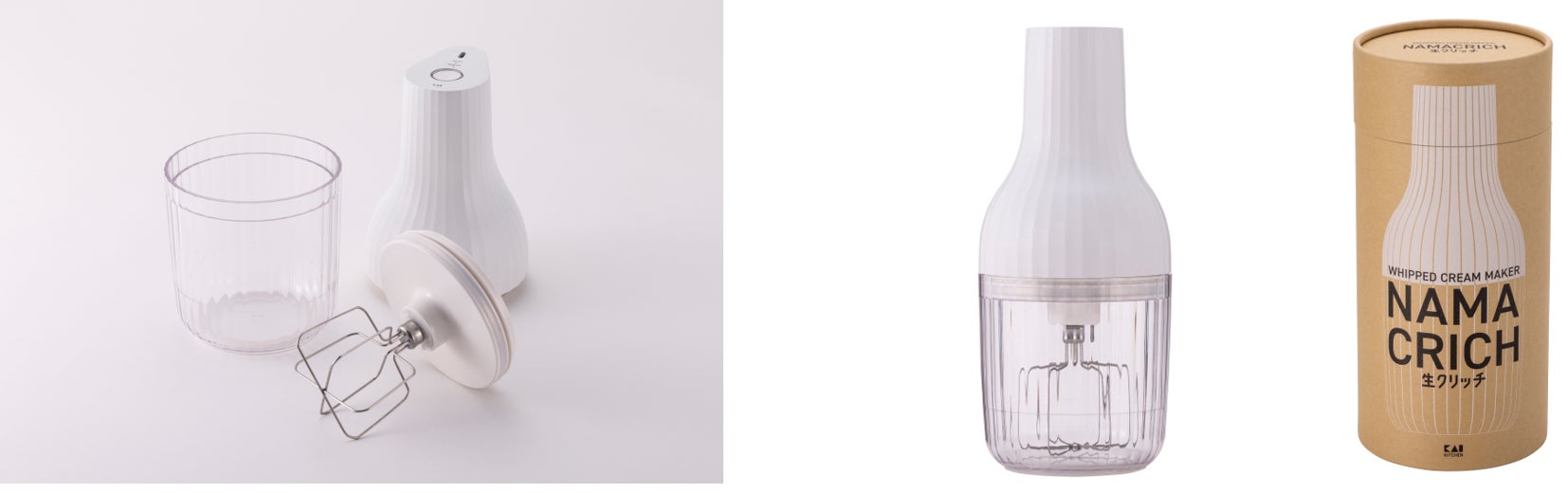 社員の発案から生まれた製品であり、提案者が日頃の体験を通して感じている想いや問題意識が量産製品におけるデザイン、開発をしっかりと支えている。「生クリームを簡単に泡立てることのできる調理家電」という明快な目的を実現するためのアルゴリズム開発やインターフェイス等での工夫など、使いやすさを実現したうえでのコンパクトな姿にも注目した。クリームをイメージさせると同時に清潔感に満ちた姿は、調理の喜びを視覚的に伝えるものともなっている。
