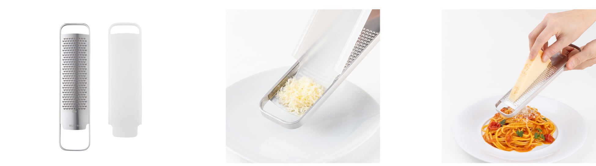 最小限のハンドルと刃部のサイズを最適化することで本体全体をコンパクトにした外形状を模索した。ハードチーズや柑橘だけでなく、生姜やにんにくなど日常的に使う食材もおろせるようにしつつ、お手入れのしやすさを両立できるよう目立ての角度や形状に拘った。刃部の裏側に残った食材を楽に集められるヘラ形状を模索し、一度のストロークで食材のほぼ全てを集めることを可能とした。