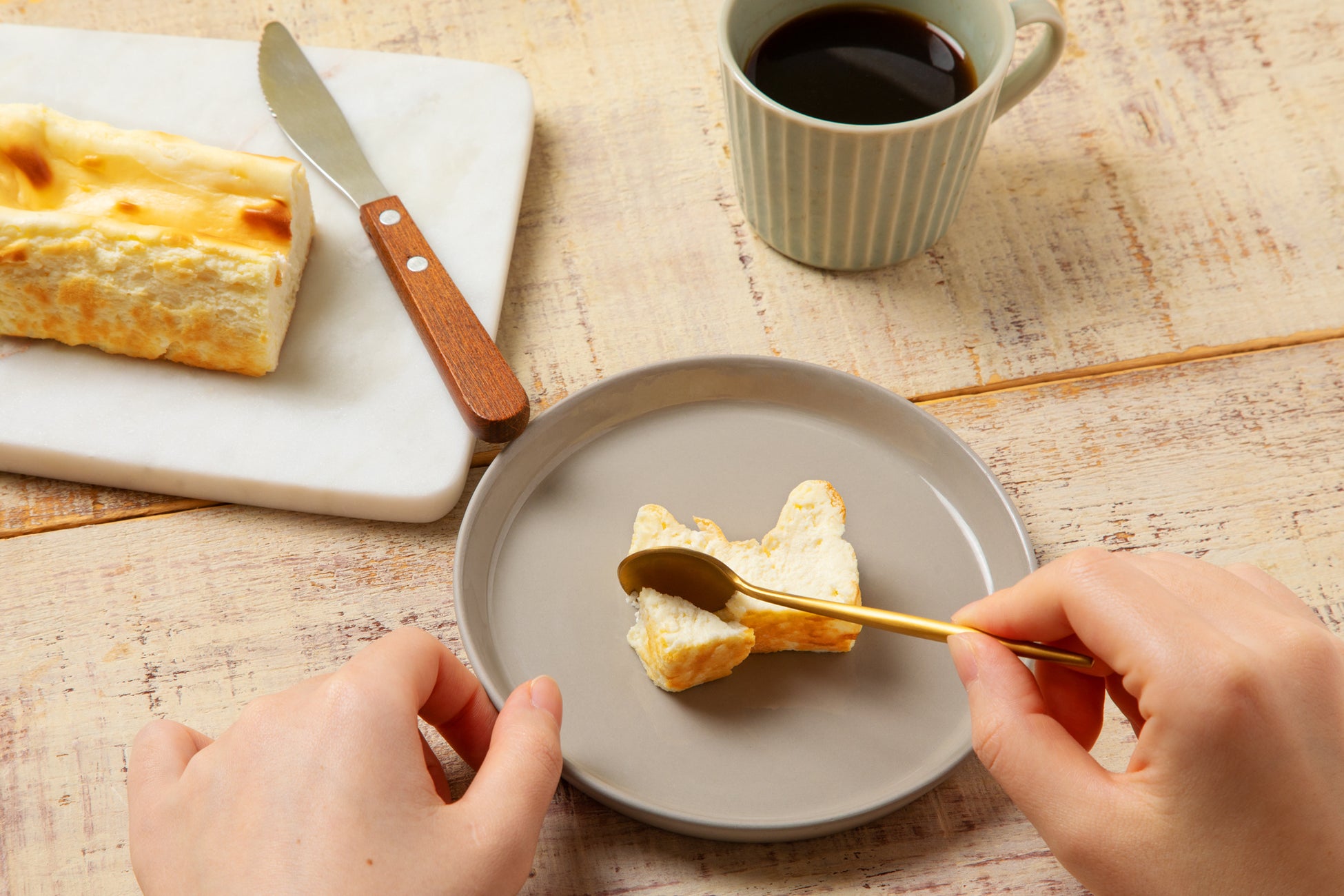 最高に美味しい「北海道産」生クリームとマスカルポーネ&クリームチーズの2種をブレンドして焼き上げた、特製ベイクドチーズケーキは、生クリームの濃厚でミルキーな美味しさと2種のチーズのコクを味わえるように、外はしっとりとなめらかで中は半熟クリーミーでとろける口溶け。