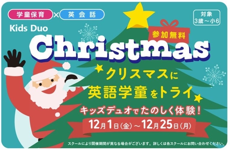 総合教育サービス事業の株式会社やる気スイッチグループ(東京・中央区、代表取締役社長:高橋 直司)が展開する英語で預かる学童保育「Kids Duo®(キッズデュオ)」は、幼児(3歳~6歳)・小学生向けに参加無料の「Kids Duo Christmas」を2023年12月1日(金)~12月25日(月)までの期間限定で開催します。( https://bit.ly/3St3EnQ )